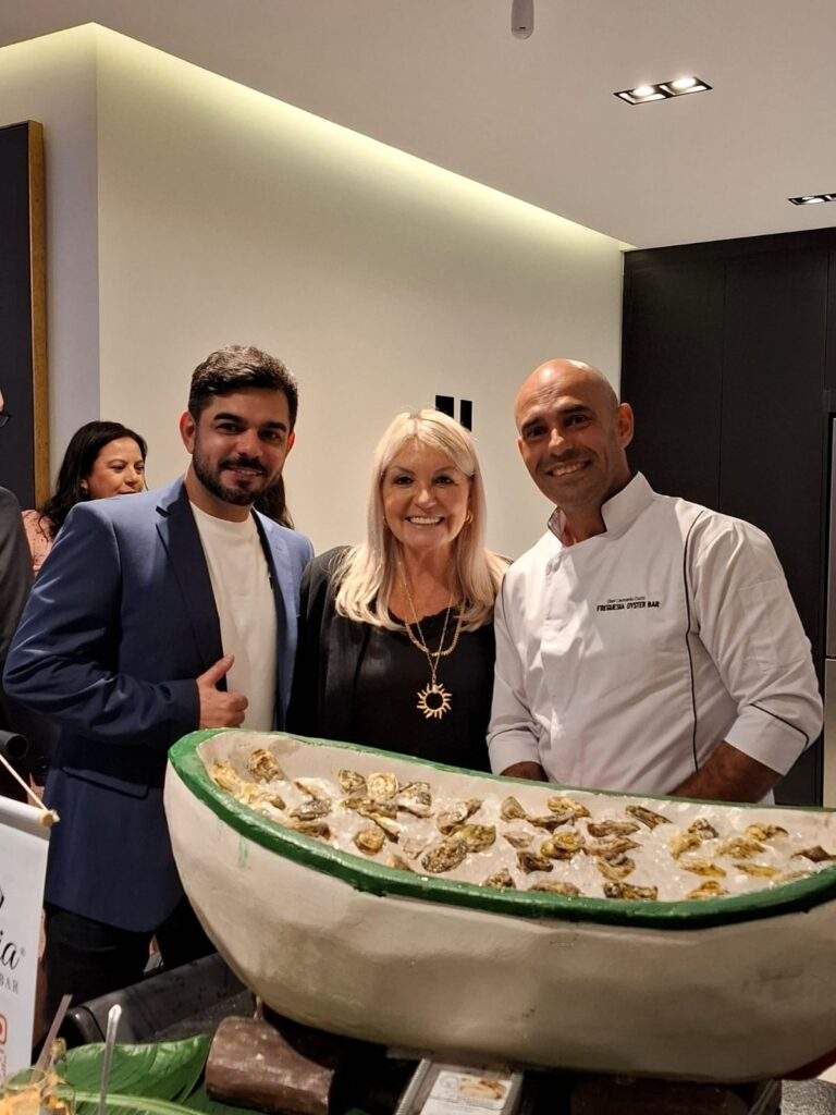 Logo na recepção, a gastronomia começou a encantar os convidados com ostras fresquíssimas servidas in natura, apresentadas pelo Chef Leonardo Costa, do Freguesia Bar, referência em frutos do mar na gastronomia catarinense. As ostras são cultivadas na Fazenda de Ostras Freguesia, localizada em Santo Antônio de Lisboa, e foram servidas com um molho especial exclusivo criado pelo chef, destacando o frescor e a qualidade do produto local.