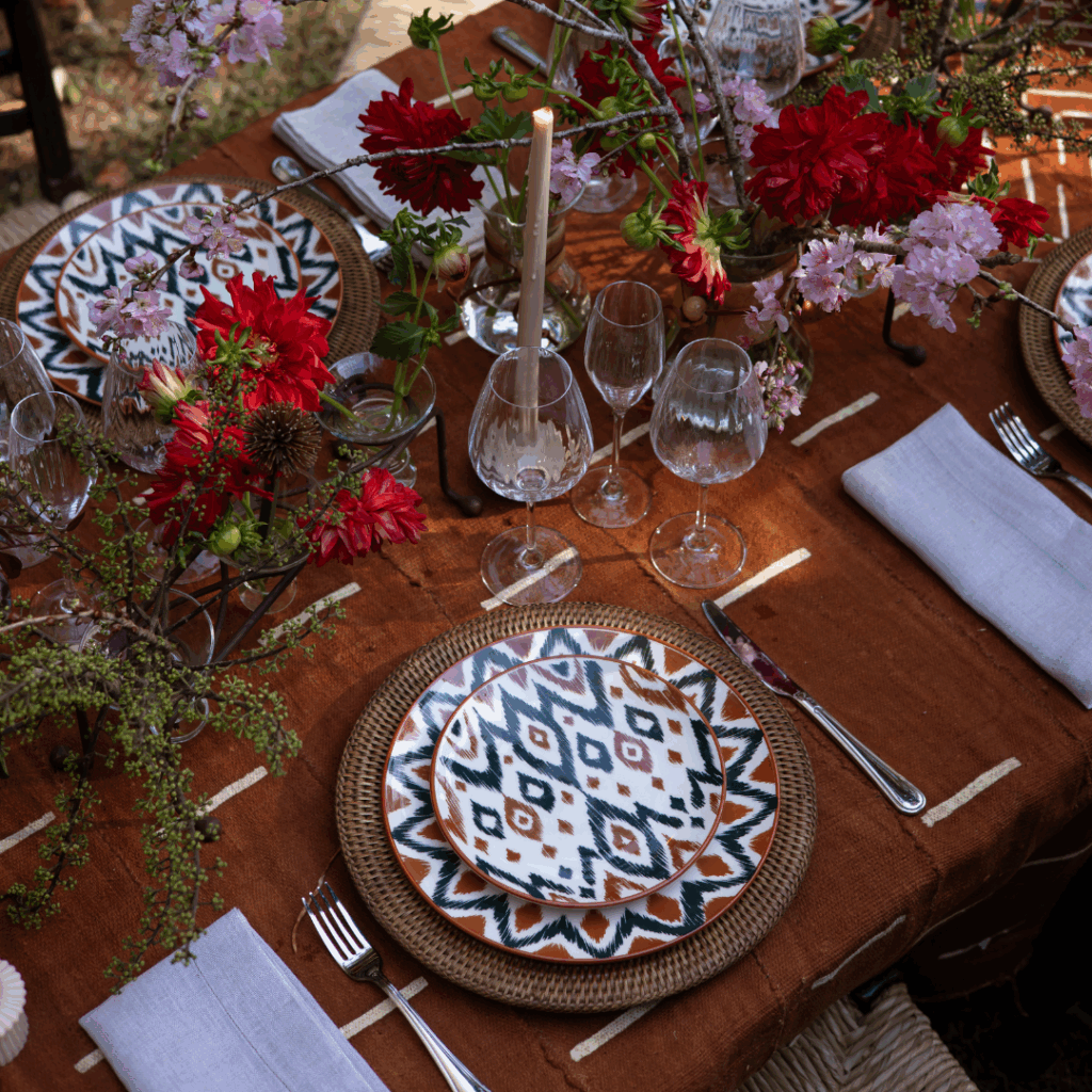 Já a coleção Unni Boho aposta em tons terrosos para criar uma atmosfera natural, aconchegante e repleta de estilo. Inspirada no espírito livre do estilo boêmio, a linha combina elementos rústicos, tecidos estampados e o charme despretensioso do boho. Suas estampas remetem ao tingimento manual dos fios antes da tecelagem, trazendo padronagens únicas e formas orgânicas que contam histórias e transformam a mesa em um espaço vivo, com alma e identidade.