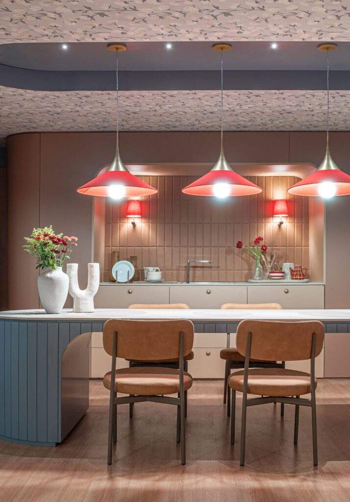 “Cada escolha de cor e estampa no meu ambiente foi pensada para despertar emoção e criar um refúgio entre o real e o imaginário. Os tons salmão e azul claro surgem como um abraço suave, trazendo uma atmosfera de acolhimento, delicadeza e pausa — como se o tempo desacelerasse dentro do espaço. As luminárias vermelhas introduzem um contraste pulsante e poético, como pequenas fagulhas de energia que aquecem o olhar e criam ritmo na composição.