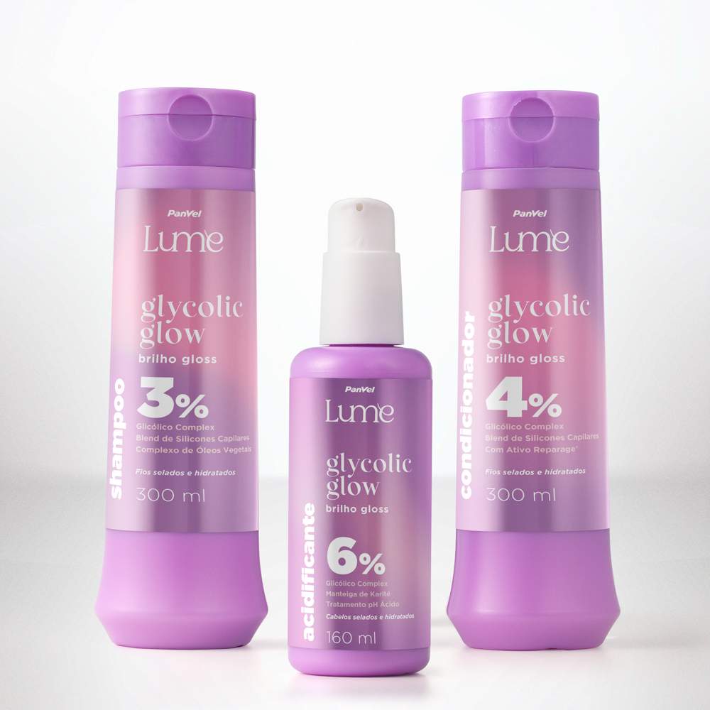 Nos cabelos, a Panvel Lume Glycolic Glow traduz os benefícios do ácido glicólico em fórmulas que cuidam da raiz às pontas. O shampoo limpa profundamente e prepara o couro cabeludo, enquanto o condicionador ajuda a reduzir a porosidade e promove a selagem das cutículas para fios mais alinhados e disciplinados. O tratamento se completa com o acidificante, que equilibra o pH e devolve vitalidade, maciez e brilho luminoso, garantindo cabelos saudáveis e com movimento natural.