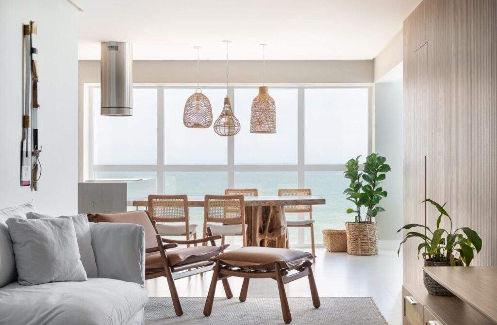O estilo praiano contemporâneo com influências do design naturalista guia toda a proposta. Linhas limpas, base neutra e tons quentes compõem-se com elementos orgânicos para criar ambientes sofisticados sem perder a espontaneidade. Desde o início, a proposta foi apostar em uma linguagem que remetesse à natureza, integrando o interior à paisagem e priorizando materiais naturais e texturas suaves. O apartamento não passou por alterações estruturais, apenas por adequações no sistema elétrico, o que reforça a sutileza do projeto de interiores ao se adaptar com eficiência à base existente.