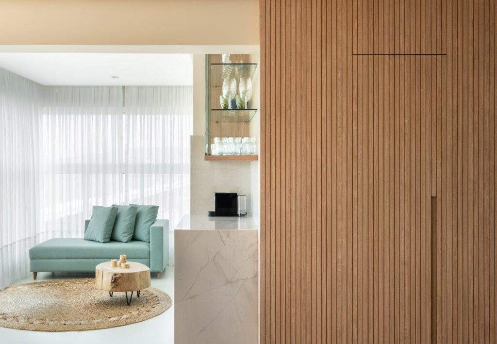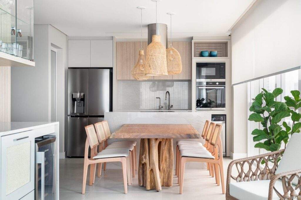 Os revestimentos e acabamentos seguem três pilares que norteiam o projeto: funcionalidade, conforto sensorial e estética natural. Como o imóvel é de veraneio, era essencial optar por materiais resistentes à umidade, de fácil manutenção e agradáveis ao toque e ao olhar. O piso em porcelanato garante praticidade na limpeza e leveza visual, enquanto a marcenaria clara em lâmina de madeira e os painéis ripados criam uma base acolhedora e atemporal. Entre os destaques estão o painel ripado em tom areia, que traz movimento e elegância ao ambiente e a mesa de jantar, com sua base orgânica, que funciona como peça central do décor.