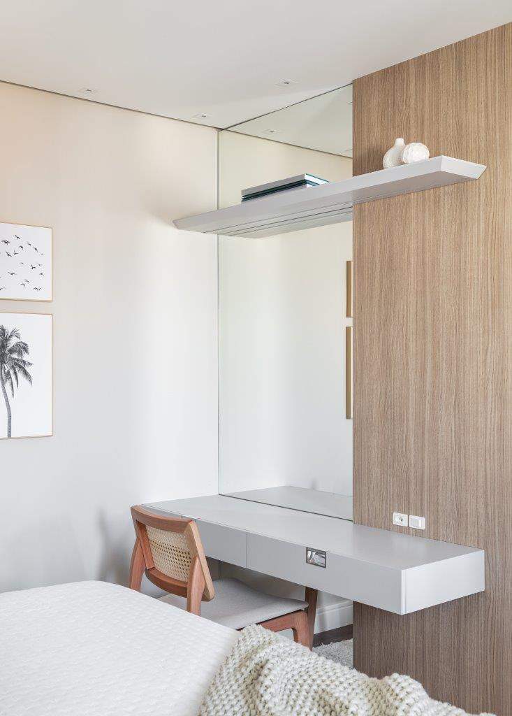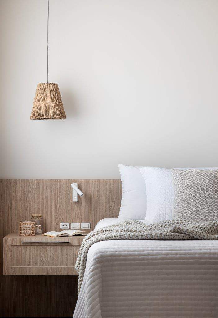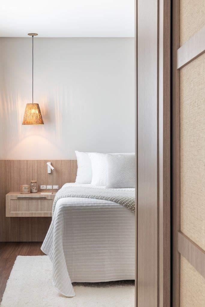O quarto principal recebeu uma cama com cabeceira em madeira natural, que acompanha mesinhas de cabeceiras embutidas, além de tecidos leves e claros nas cortinas e no enxoval, para manter o frescor e a simplicidade desejados.