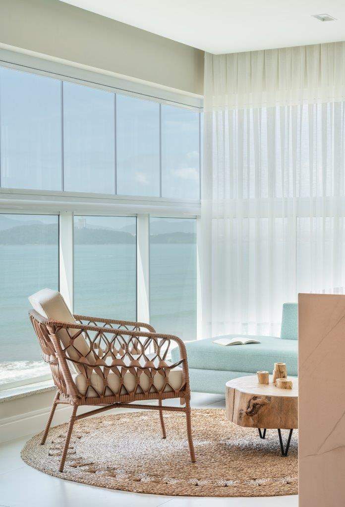 A varanda se estende como uma extensão contemplativa da área social. Uma poltrona de fibra com almofadas cria um recanto perfeito para leitura ou pausa, com vista direta para o mar. Uma mesa de centro de formas orgânicas complementa a composição. Neste cenário, cada escolha material reforça a narrativa de um espaço atemporal e profundamente conectado com a natureza.