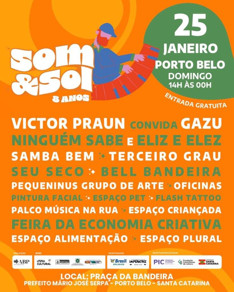 No ano passado, o Som&Sol deu início a uma circulação estadual em celebração aos seus oito anos de história, que segue neste começo de 2026. O giro por diversas cidades começou justamente por Porto Belo e agora retorna ao município para dar o pontapé inicial no ano, com a primeira edição de mais uma temporada dedicada à arte, à cultura e à economia criativa. O evento é gratuito e acontece na Praça da Bandeira, no Centro de Porto Belo, no domingo (25), das 14h à 0h.