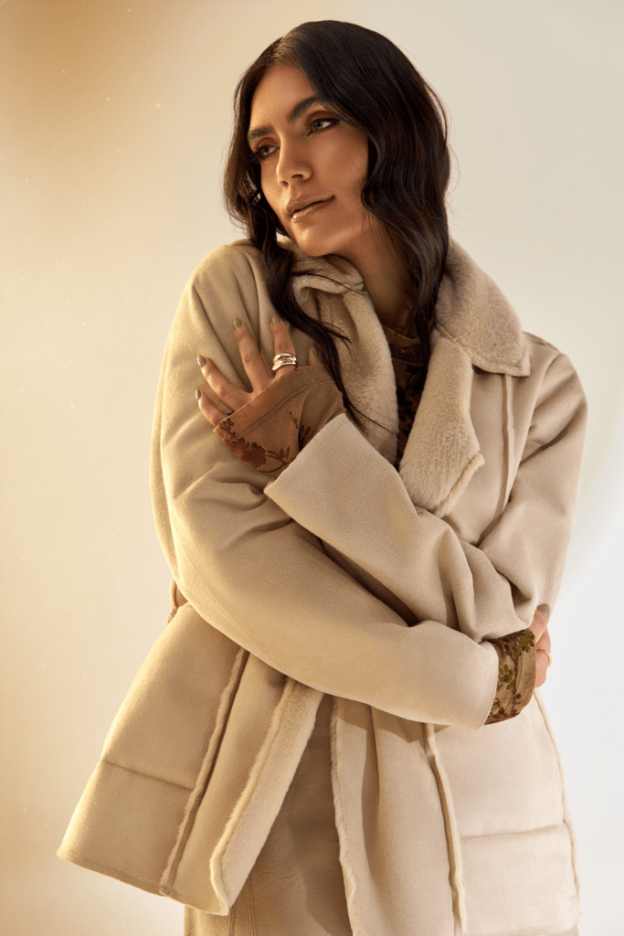 Já a Pele Suede retorna à coleção com o mix de texturas em modelos de jaqueta e casaco, combinando o toque aveludado externo com o interno em pele.