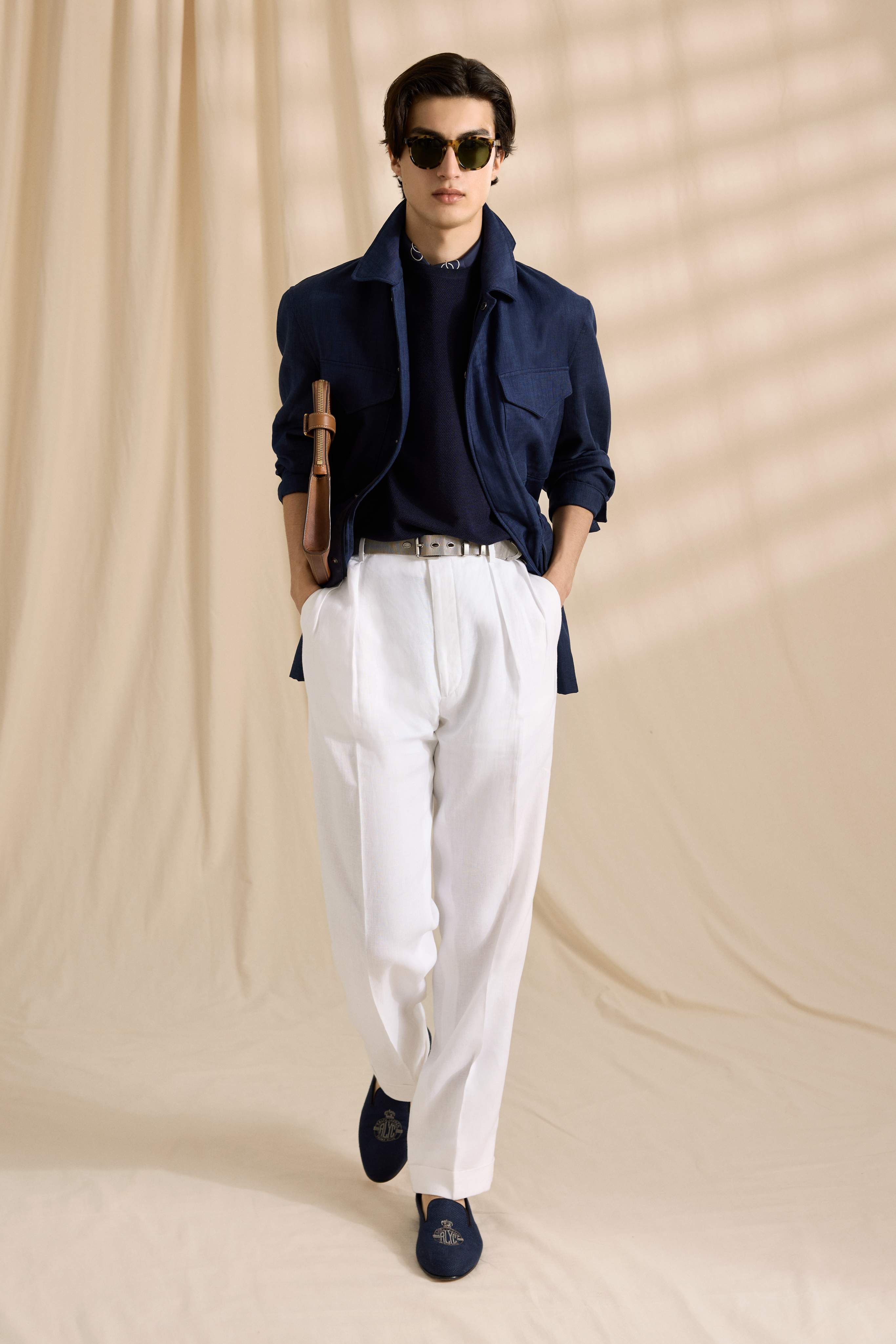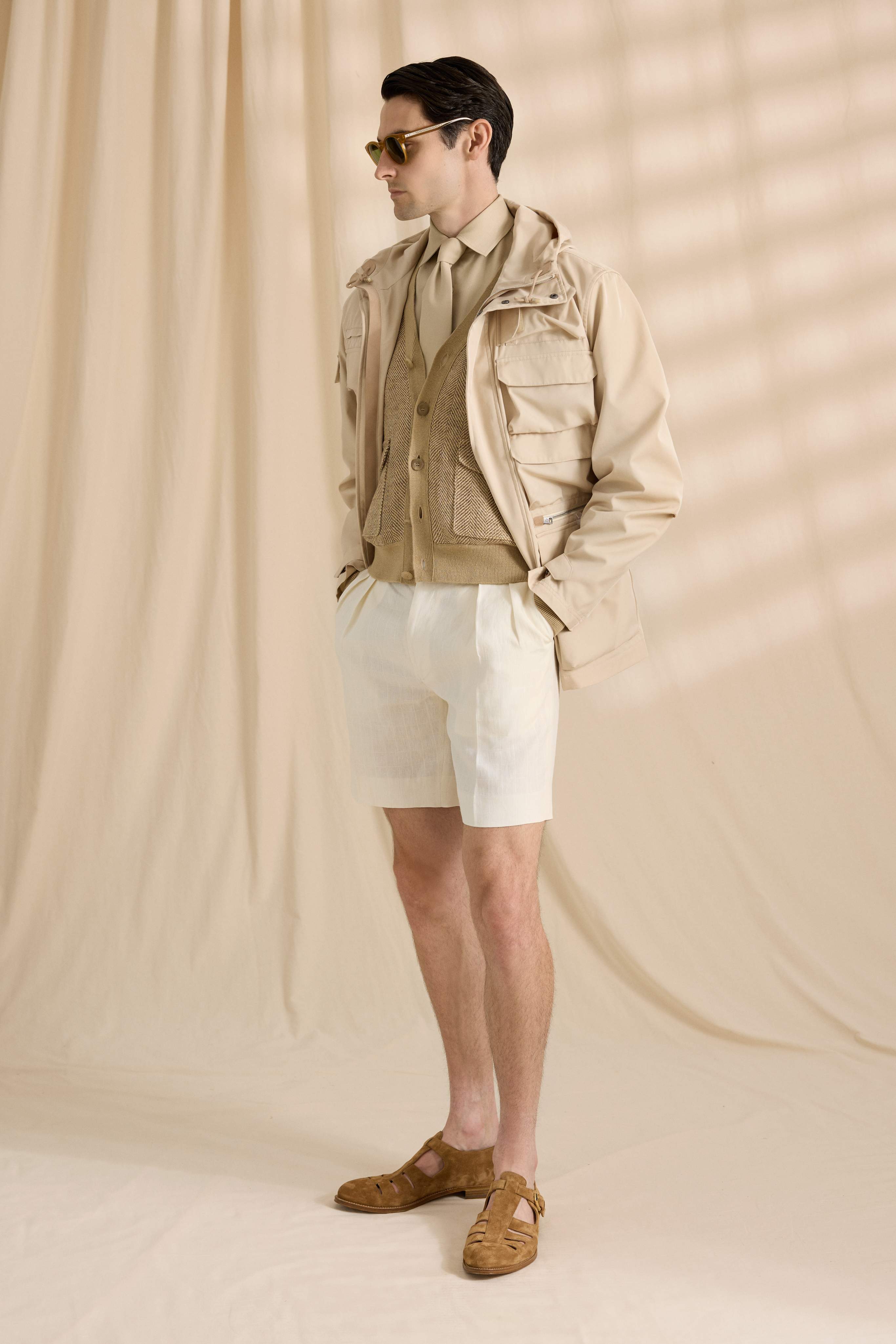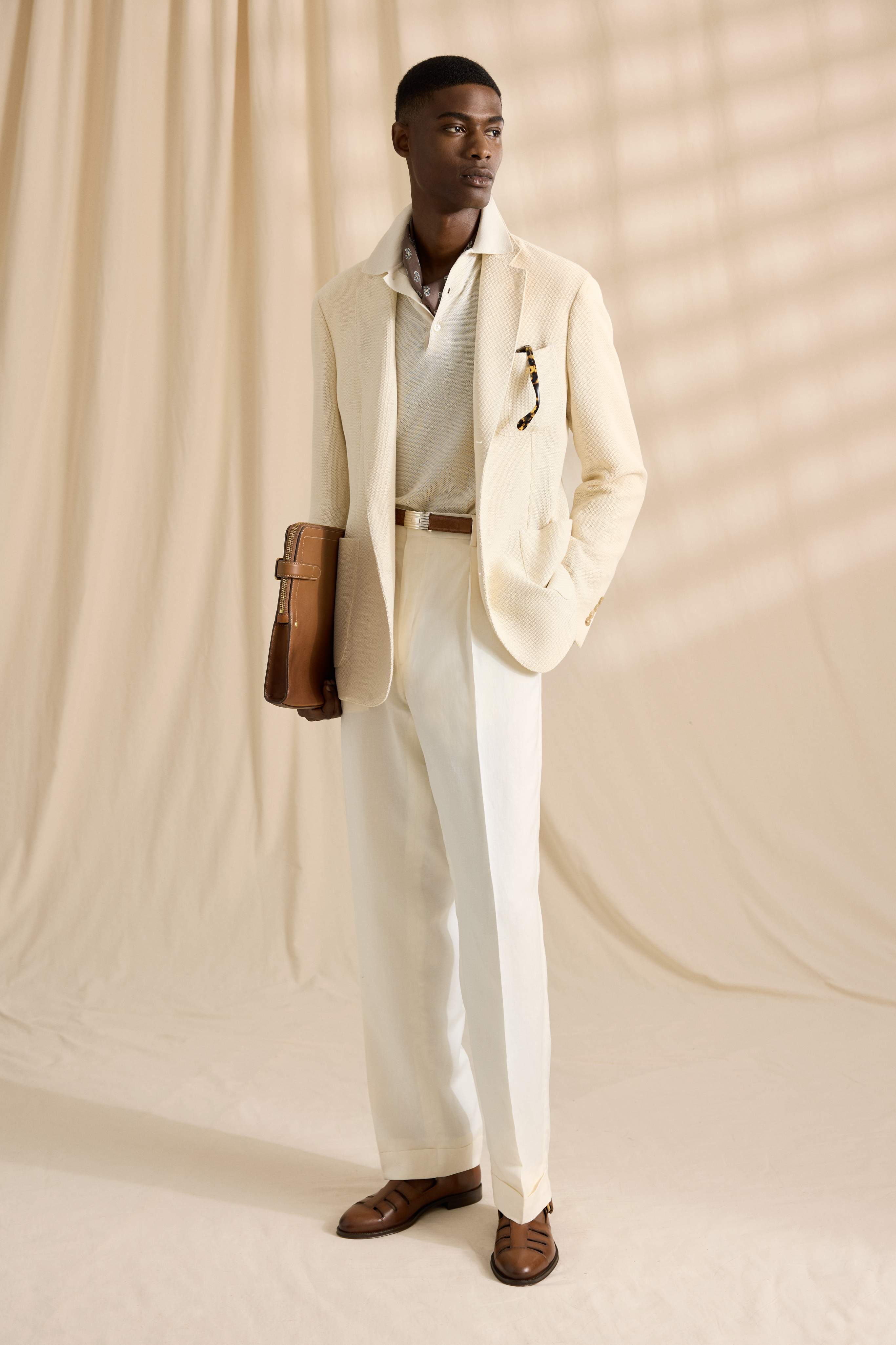 A elegância diurna se revela em blazers esportivos de trama aberta, malhas descontraídas e texturas luxuosas de seda com linho, expressas em uma paleta sofisticada de tons terrosos como bege, marfim, marrons e pretos. A coleção incorpora um luxo discreto, com detalhes utilitários cuidadosamente pensados e um caimento moderno e relaxado. Acessórios de couro feitos à mão, bolsas e calçados de verão completam cada visual.