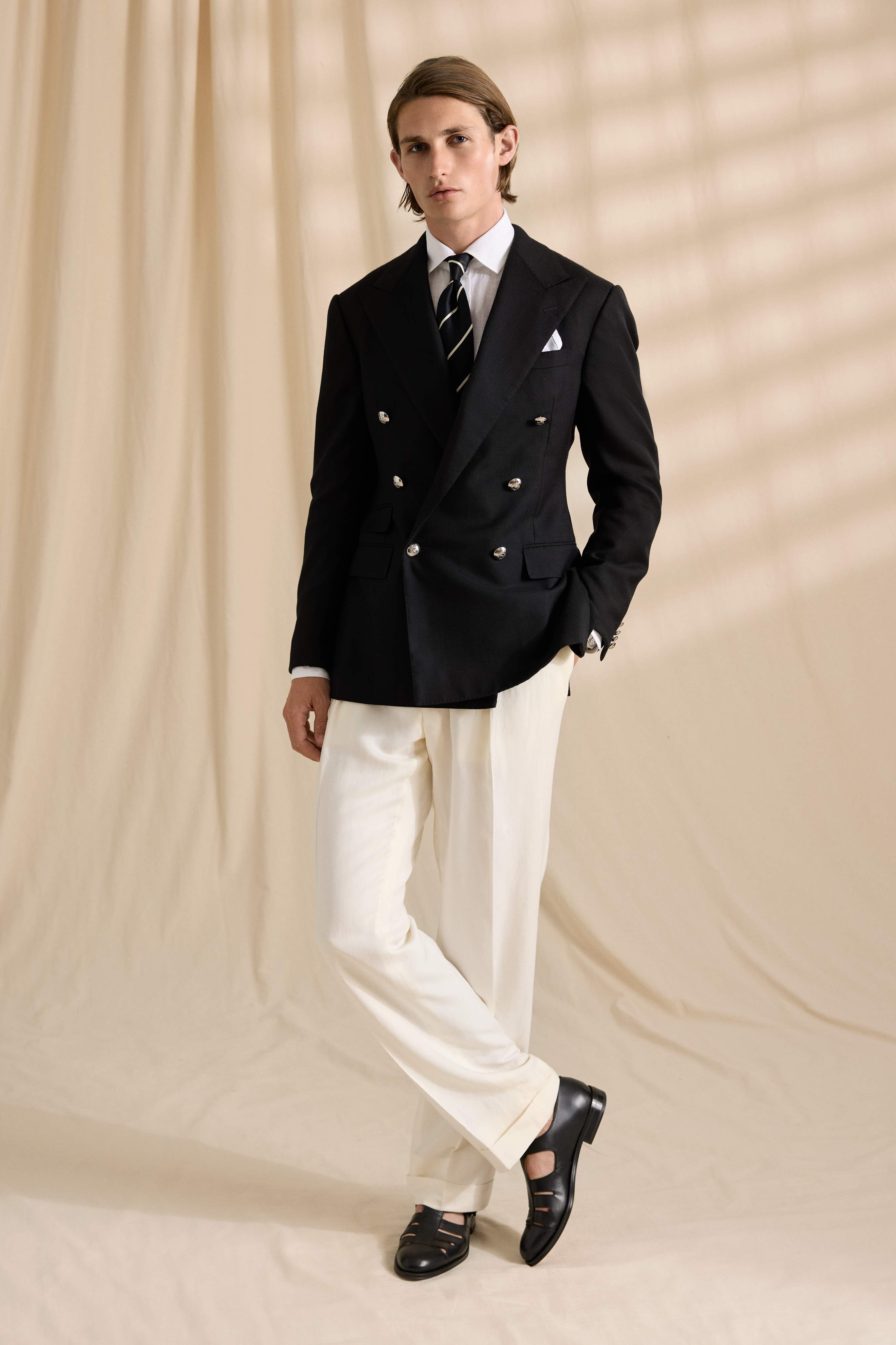 Para o auge do verão, a elegância marítima ancora a coleção por meio de alfaiataria impecável em linho e algodão, complementada por malhas com listras náuticas em tons de azul e branco. Espadrilles clássicas e detalhes cromados refletem a união harmoniosa entre luxo e herança náutica.