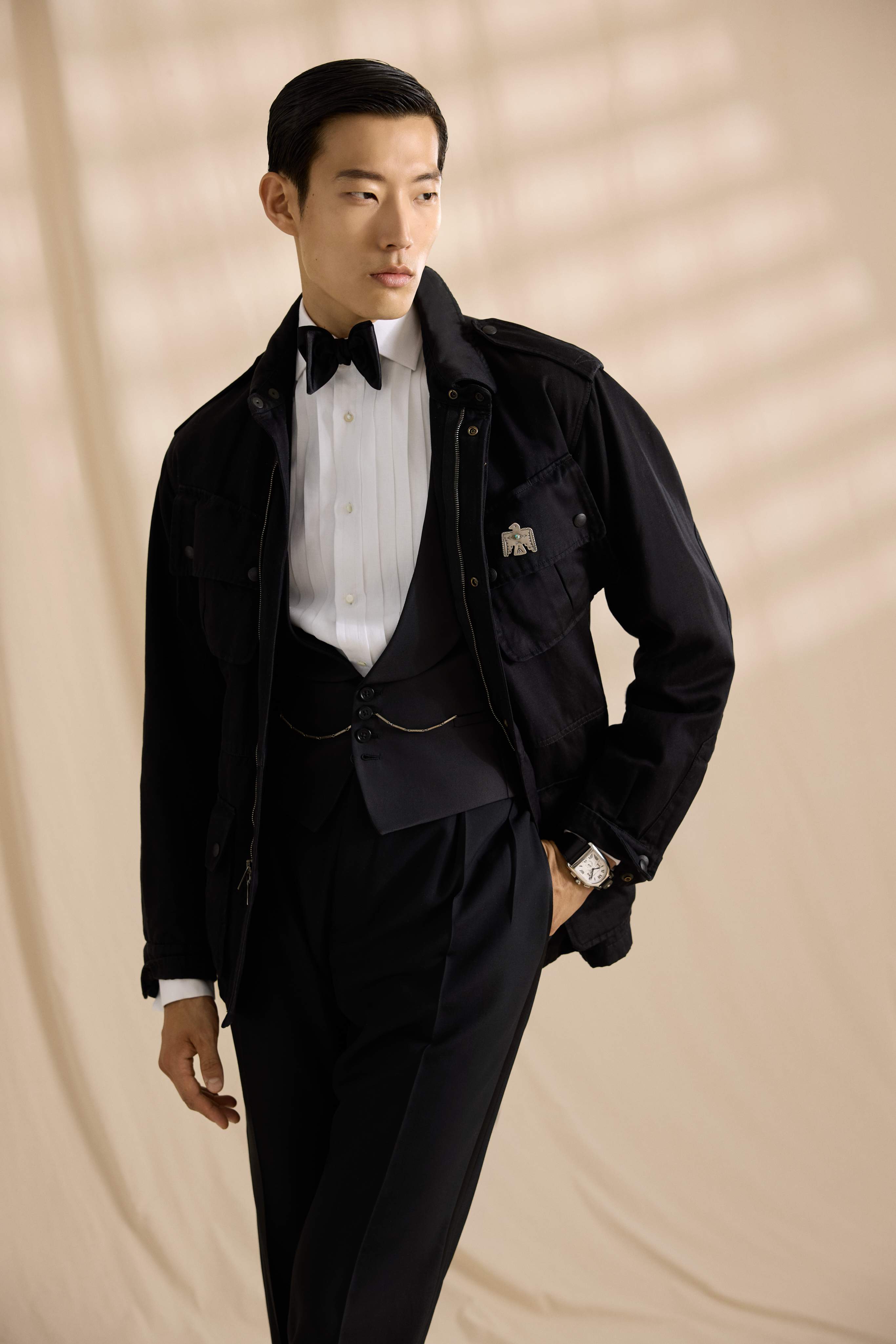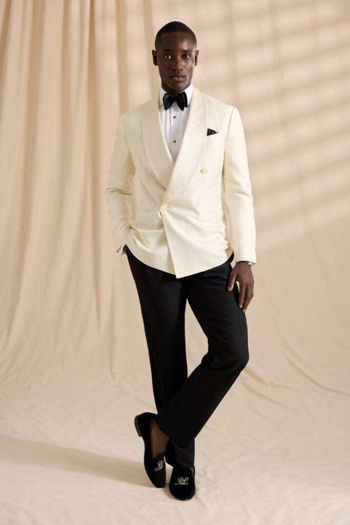 O vestuário formal icônico é reinventado em uma gama de pretos e tons neutros, onde smokings luxuosos de seda texturizada se encontram com ternos inovadores de seda em padrão xadrez Glen e estampas inspiradas na estética Art Déco. Essa fusão magistral entre o requinte casual e a elegância formal — uma assinatura de Ralph Lauren — cria uma transição perfeita do dia para a noite.