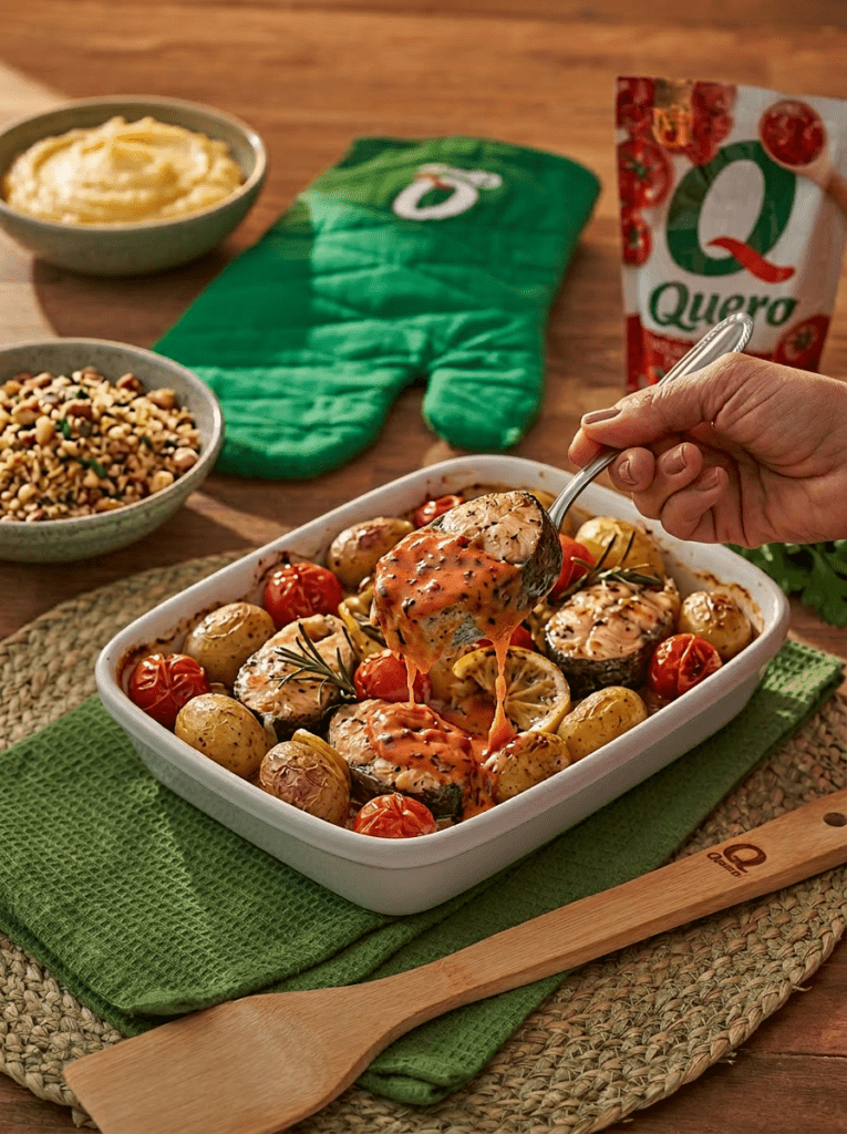 “Na Páscoa, a gente quer estar com a família e não apenas focado na cozinha. Essa é uma data com pratos clássicos, como o peixe, e o segredo para dar uma cara nova é garantir suculência e sabor rápido no molho. Quando você usa uma boa base de batatas e tomates, consegue construir aquela combinação perfeita e nutritiva em poucos minutos. Você traz a cor e a textura de uma comida que parece ter ficado horas apurando no fogo, mas com uma praticidade que salva o seu feriado”, ensina Roberta Garcia, Chef e Consultora Gastronômica da Quero.