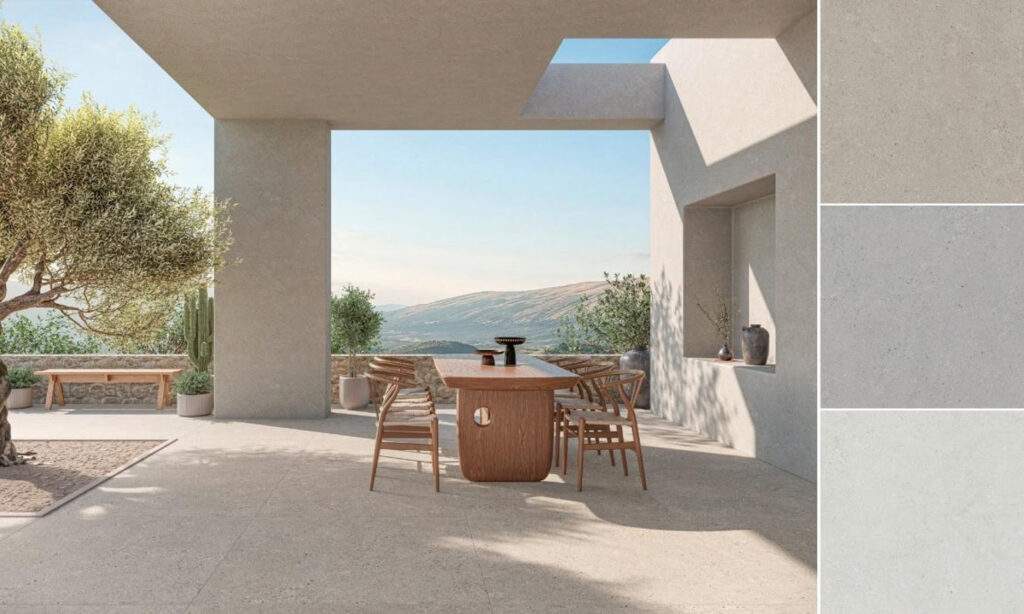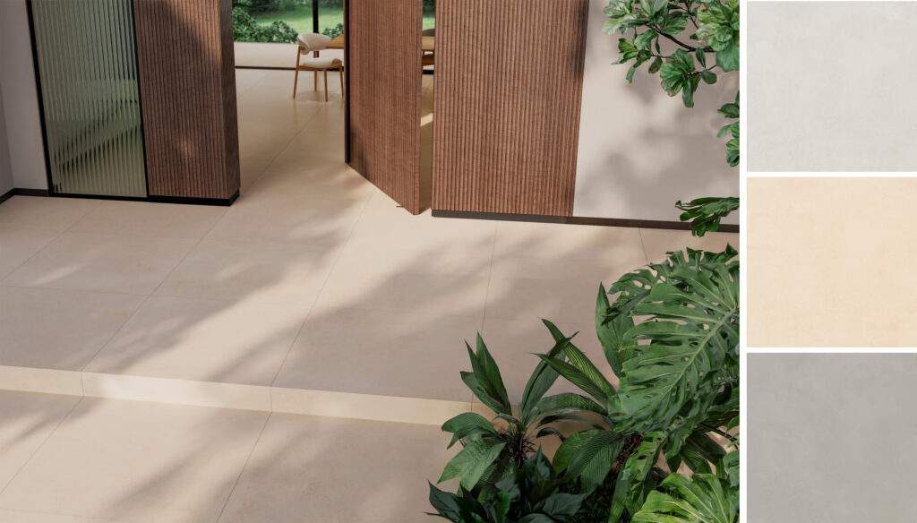 Série Kronos amplia sua presença no portfólio com a incorporação do SuperFormato 120 x 120 cm nas três tonalidades Concrete, Greige e Off-White. Com estética contemporânea inspirada no concreto, a linha reforça sua versatilidade tanto para ambientes internos quanto externos.