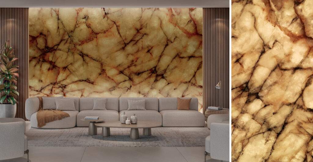 Com a potência ótica da beleza translúcida que causa um impacto absoluto, Lumina é inspirada na estética exótica das rochas retroiluminadas. Seus veios orgânicos em tons âmbar, dourado e cobre, percorrem a superfície das peças com um efeito translúcido e vibrante — como se a luz emanasse de dentro para fora.