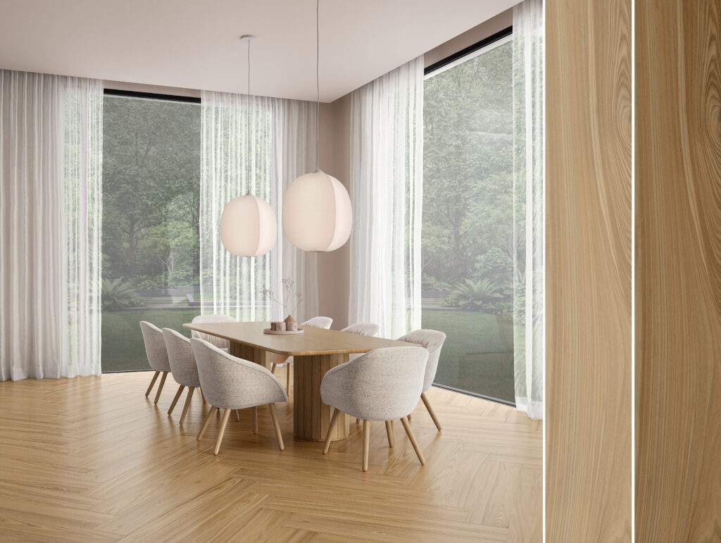 Com veios lineares e estética sofisticada, a Série Nogal é indicada para áreas internas de tráfego intenso (G5), unindo aconchego visual, resistência técnica e atemporalidade em projetos que valorizam o calor da madeira com a durabilidade do porcelanato | Foto: Divulgação Roca Cerámica
