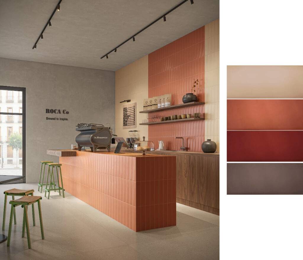 Nas cores Clay, Tile, Carmine e Brown, a Série Ombré é aclamada por sua textura suave, ritmo visual e efeito destonalizado para o revestimento de paredes | Foto: Divulgação Roca Cerámica