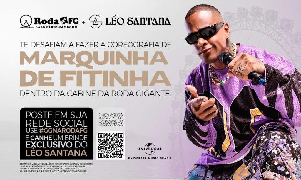 Em uma ativação inédita de Carnaval, a Roda FG e a gravadora Universal Music Brasil firmaram uma parceria que une entretenimento e música em Balneário Camboriú. A iniciativa promove o novo single de Léo Santana, intitulado “Marquinha de Fitinha”, por meio de uma experiência imersiva que desafia o público a registrar a coreografia da faixa a 82 metros de altura. A ação ocorre dentro das cabines da roda-gigante, que são equipadas com sistema de som, permitindo que a trilha acompanhe os visitantes durante todo o percurso.