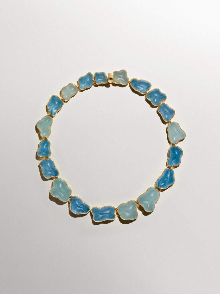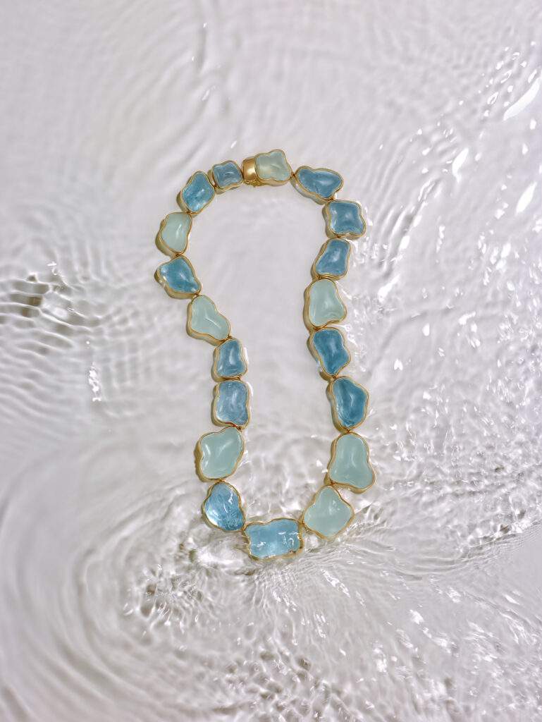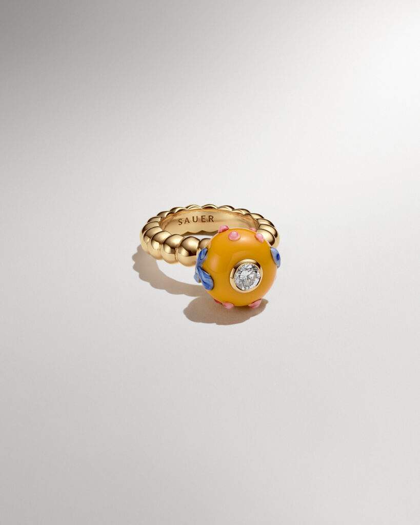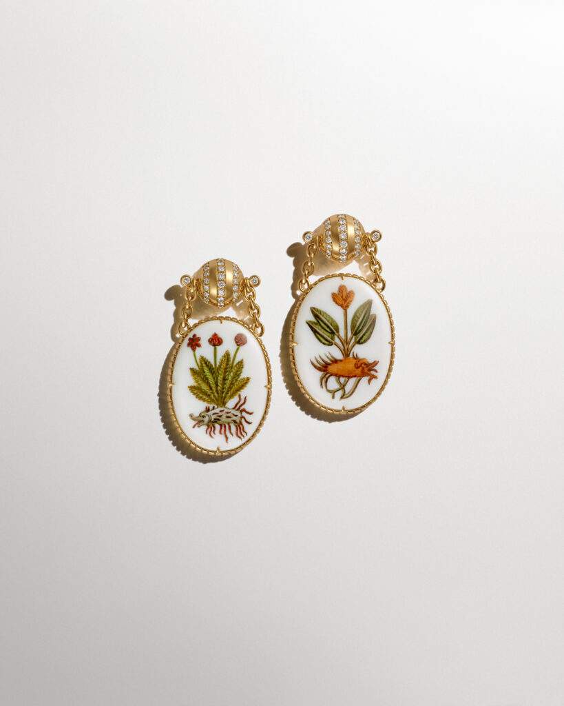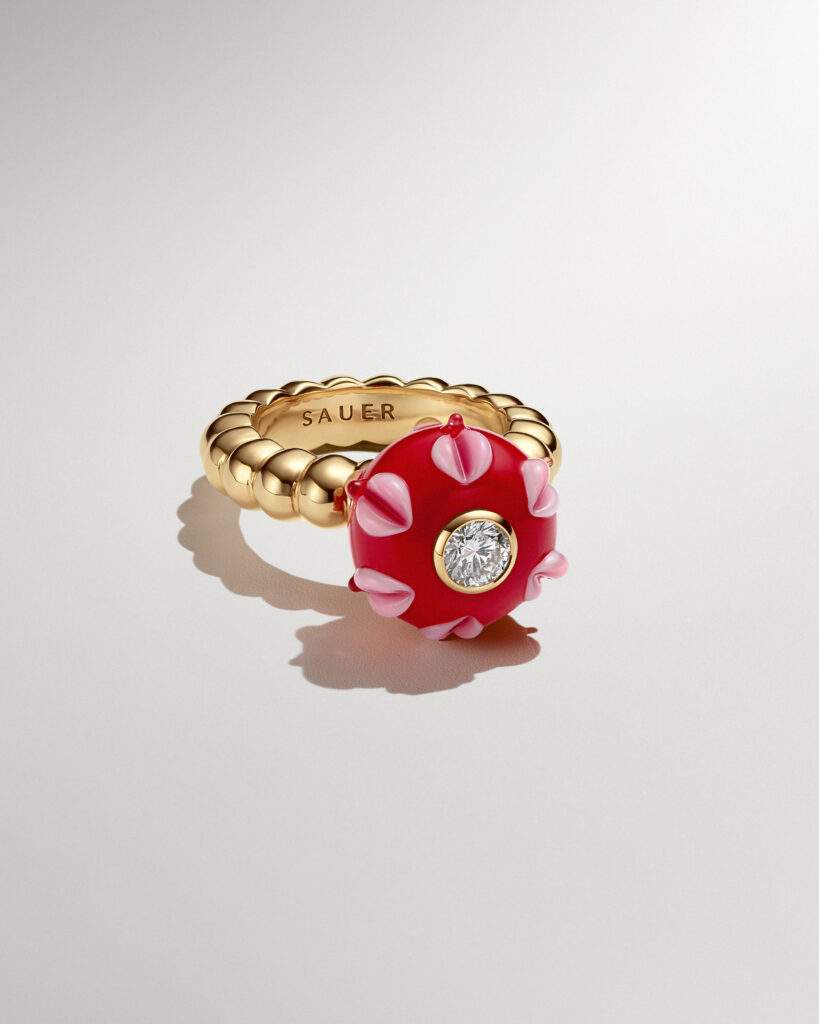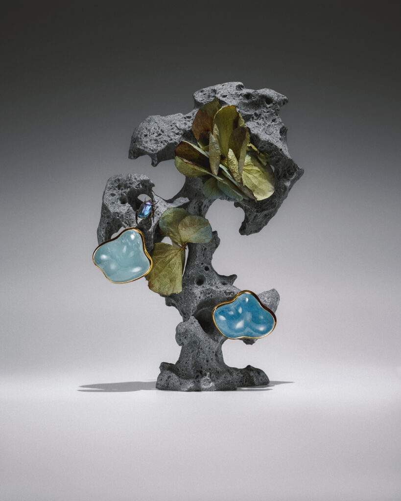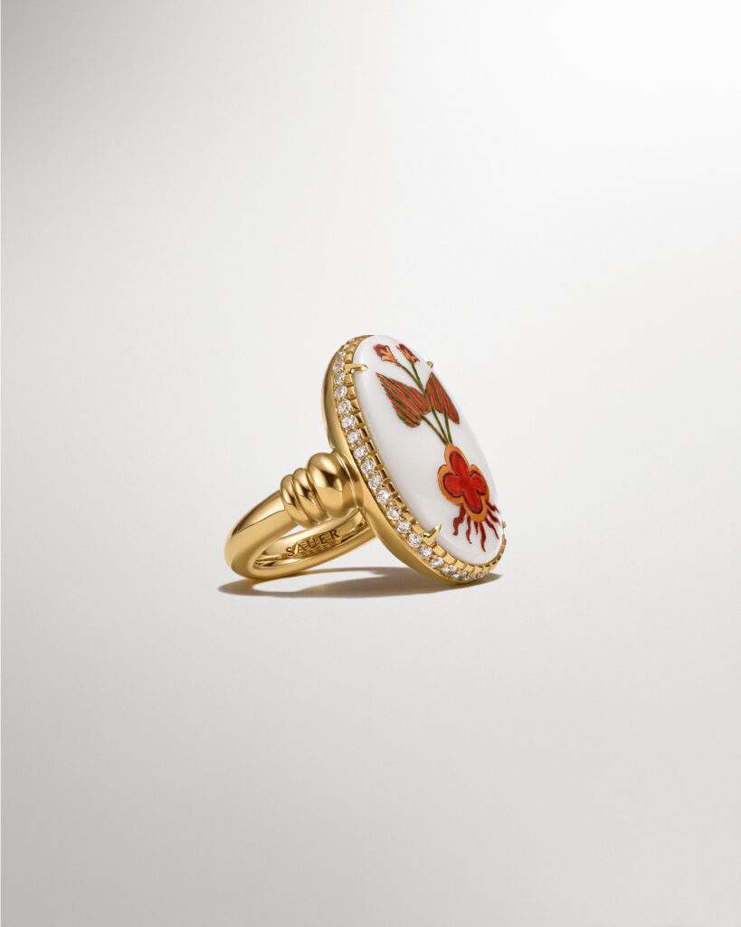 No campo material, a marca amplia seu repertório ao explorar novas combinações e técnicas. Águas-marinhas esculpidas evocam formas translúcidas, vidros de Murano trazem leveza e luminosidade, enquanto madeiras entalhadas acrescentam densidade e textura orgânica. Pela primeira vez, a SAUER incorpora porcelana pintada à mão em suas criações. O conjunto é finalizado com gemas como esmeraldas, rubis, safiras e diamantes, reforçando a ideia de uma botânica rara e imaginada.