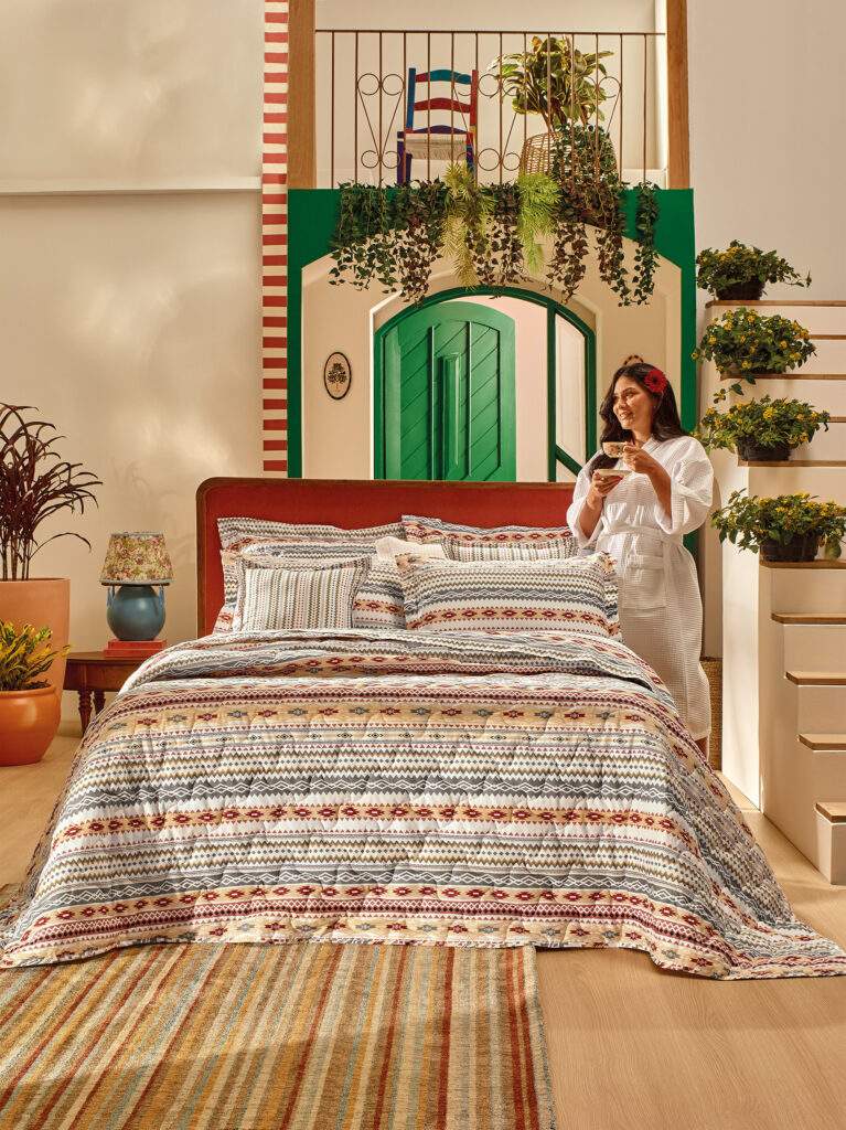 A paleta reúne tons intensos variando entre terracota, azul profundo e verde folhagem, em diálogo com neutros quentes e tons off-white. O resultado é um equilíbrio visual: vitalidade para os espaços de convivência e acolhimento para o descanso, sem excessos. As texturas foram pensadas para proporcionar toque macio e sensação de aconchego, enquanto os padrões valorizam a tradição gráfica e os acabamentos manuais que reforçam a identidade cultural da coleção.