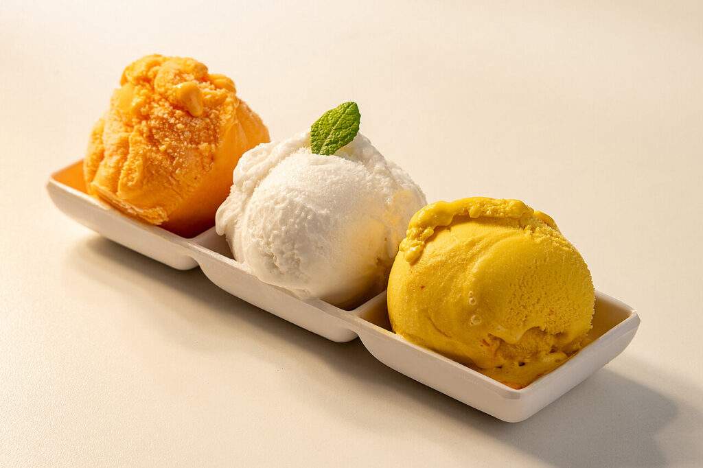 Trilogia de sorvetes nos sabores manga com maracujá, acerola e abacaxi com coco, servida em taça de banana split. Acompanha chips crocantes de banana-da-terra com açúcar e canela, finalizados com calda artesanal de maçã e menta.