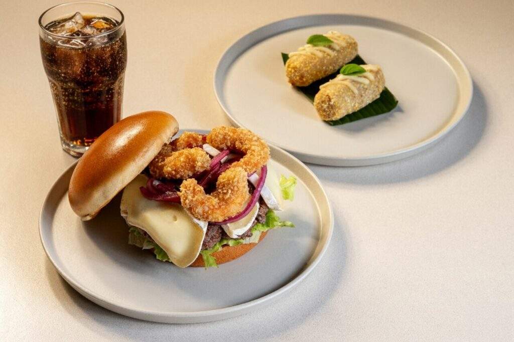 Entrada com croqueta de peixe da estação empanada em farinha de milho e mandioca, servida com maionese de maracujá. No principal, hambúrguer artesanal no brioche, queijo brie, picles de cebola roxa, tomate italiano, alface, camarão rosa empanado e maionese de manjericão com limão siciliano e pimenta dedo-de-moça. Valor: R$ 55,00 (serve 1 pessoa)
