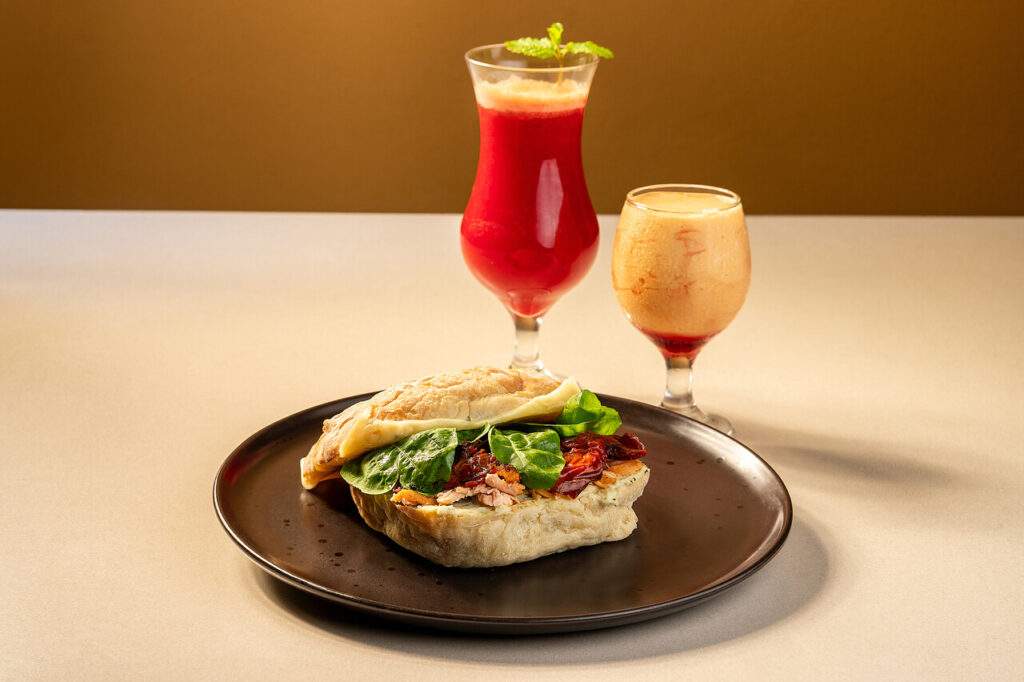 Toaste de ciabatta com creme de catupiry e pesto de manjericão, lascas de salmão assado, tomate confitado com alho-poró, rúcula e queijo derretido. Na sobremesa, creme de papaia com sorvete e licor de cassis. Para beber, suco de laranja, guaraná e beterraba.