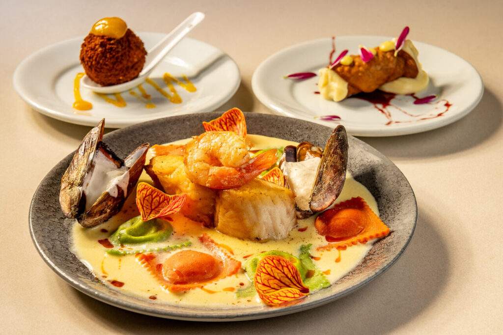 Entrada com nhoque artesanal recheado, empanado e servido com molho pomodoro. Principal: peixe branco em crosta de pistache, camarão, marisco e ravióli artesanal recheado, ao molho limoneto. Sobremesa: cannoli de chocolate com brigadeiro de limão-siciliano, gel de limão curd e calda de vinho tinto com especiarias.