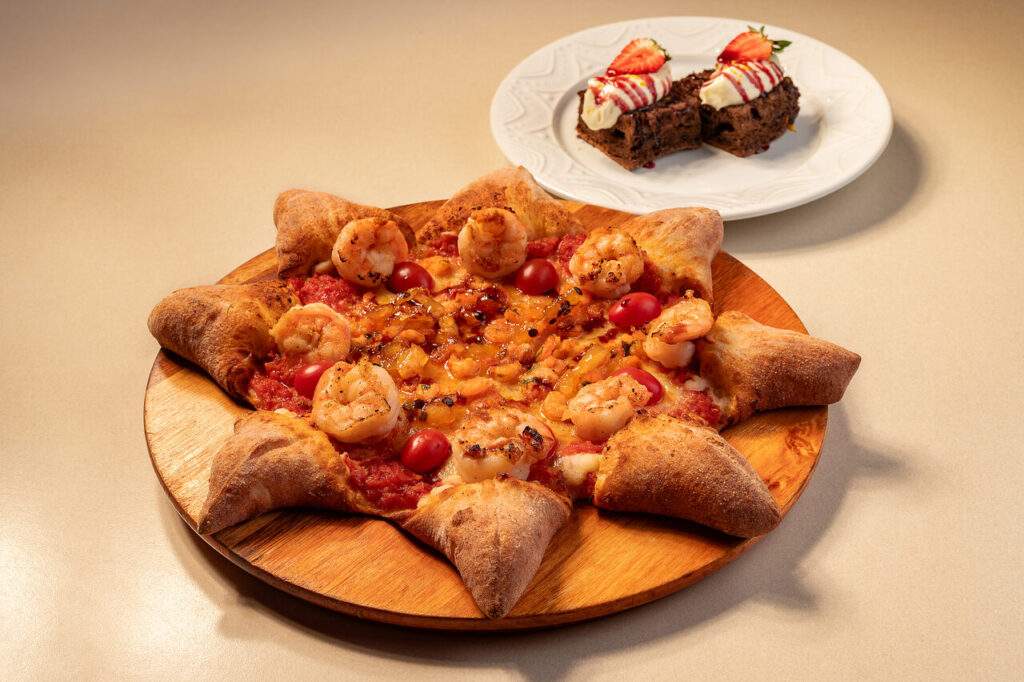 Pizza italiana com molho de tomate, muçarela, camarão flambado na cachaça e chutney de frutas tropicais, finalizada com redução de aceto e cereja fresca. Sobremesa: focaccia de chocolate e mel, coberta com creme de mascarpone, calda de morango ao vinho e laranja.
