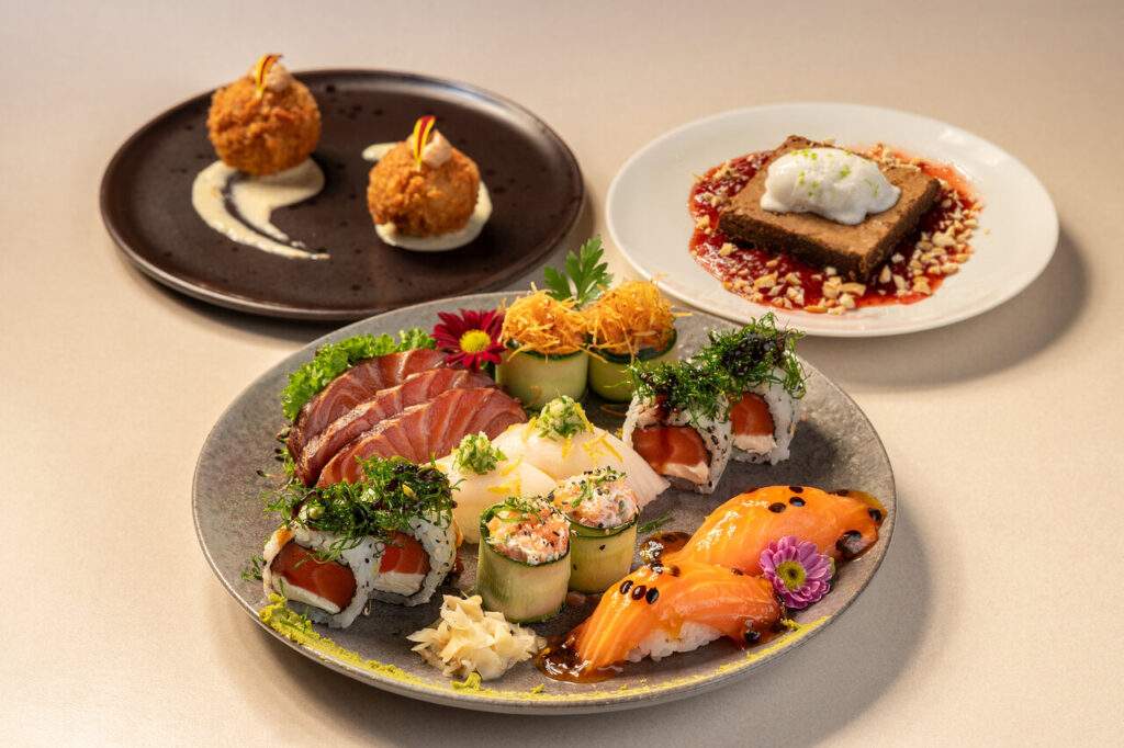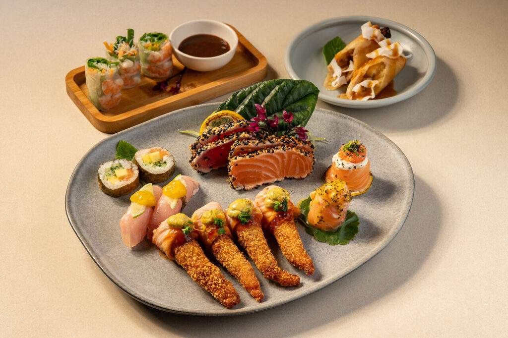 Entrada: ceviche de sororoca com laranja e maracujá. Principal: poke com salmão, lombo suíno empanado, abacaxi, uva, legumes, picles e chips de batata-doce. Sobremesa: gohan empanado e recheado com doce de leite, banana e leite condensado, finalizado com amendoim crocante.
