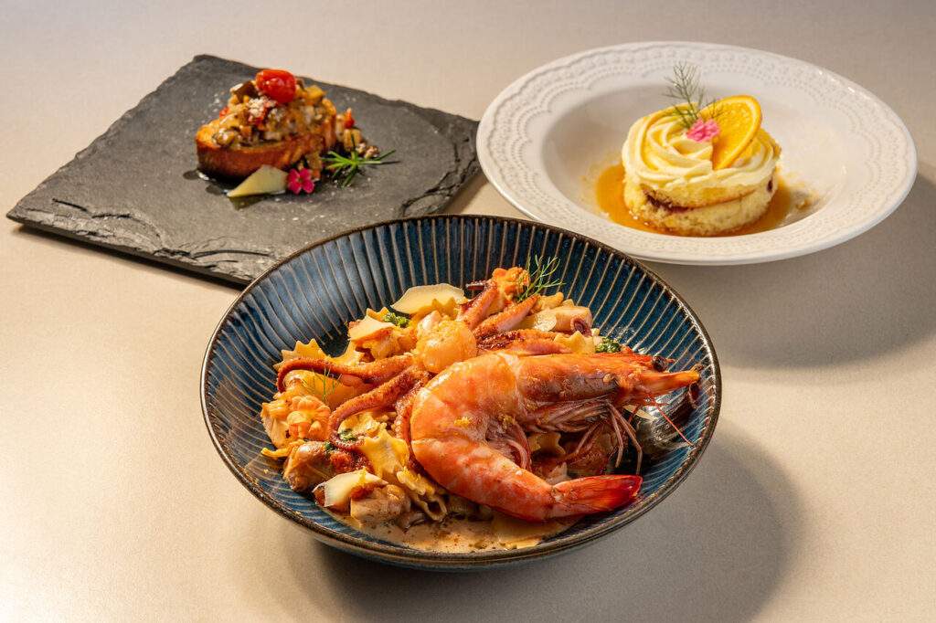 Entrada: bruschetta com caponata de legumes e degustação de parmesão. Principal: massa artesanal Malfadine com vieira, camarão, polvo e peixe branco, ao vinho branco, limão-siciliano e pesto de tomate seco. Sobremesa: bolo de laranja com sorvete italiano de doce de leite, geleia de frutas vermelhas e creme diplomata. Valor: R$ 95,00 (serve 1 pessoa)