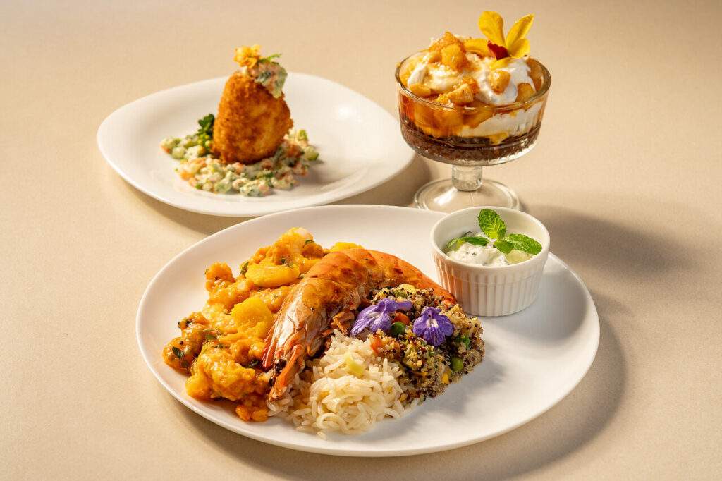 Entrada: rol de linguado recheado com queijo, rúcula e tomate seco, empanado na farinha panko. Principal: bobó de camarão com camarão grelhado, cuscuz marroquino com quinoa, arroz de alho-poró e molho refrescante de hortelã. Sobremesa: cream cheese aerado com base de chocolate e abacaxi caramelizado.