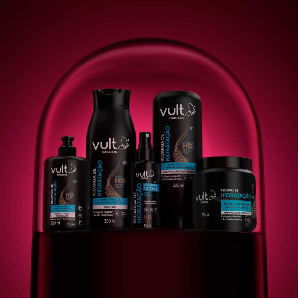 A linha de cabelos Vult conta com 60 itens 100% veganos, desenvolvidos para todos os tipos de cabelo, do liso (1A) ao crespo (4C). Com tecnologia exclusiva HD, cada produto combina aminoácidos de alto poder reparador, capazes de agir profundamente fio a fio para restaurar a saúde e a vitalidade capilar. O portfólio é dividido em 9 linhas: cinco de tratamento — Hidratação, Reconstrução, Nutrição, Força e Glow Acid — e quatro específicas por tipo de cabelo — Liso Profundo, Ondulados 2A a 2C, Cachos 3A a 3C e Crespos 4A a 4C.