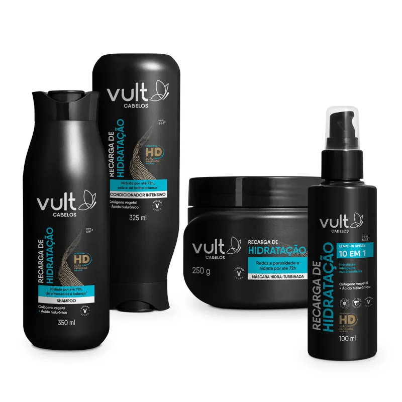 Combo Vult Cabelos Recarga de Hidratação reúne itens que valorizam a beleza natural dos cabelos e incentivam o cuidado diário, mantendo-os saudáveis e radiantes. O Shampoo Recarga de Hidratação limpa de forma suave, sem ressecar, deixando os fios alinhados e livres de frizz. Enriquecido com Colágeno Vegetal e Ácido Hialurônico, quando utilizado junto com a linha completa, garante hidratação profunda por até 72 horas, proporcionando balanço e maciez. O Condicionador Intensivo sela a cutícula da fibra capilar, intensificando o brilho e facilitando o desembaraço, tornando os fios até três vezes mais fáceis de pentear. Já a Máscara Hidra-Turbinada atua na redução da porosidade e promove hidratação duradoura, sendo ideal para a etapa de hidratação do cronograma capilar, com resultados imediatos e fios desembaraçados em instantes. Para finalizar, o Leave-In Spray 10 em 1 entrega multibenefícios em um único produto: hidrata profundamente, preenche áreas porosas, fortalece a fibra, reduz nós, intensifica o brilho, revitaliza os fios e protege contra o calor de ferramentas térmicas de até 230°C, sendo um aliado indispensável para a rotina de cuidados capilares.